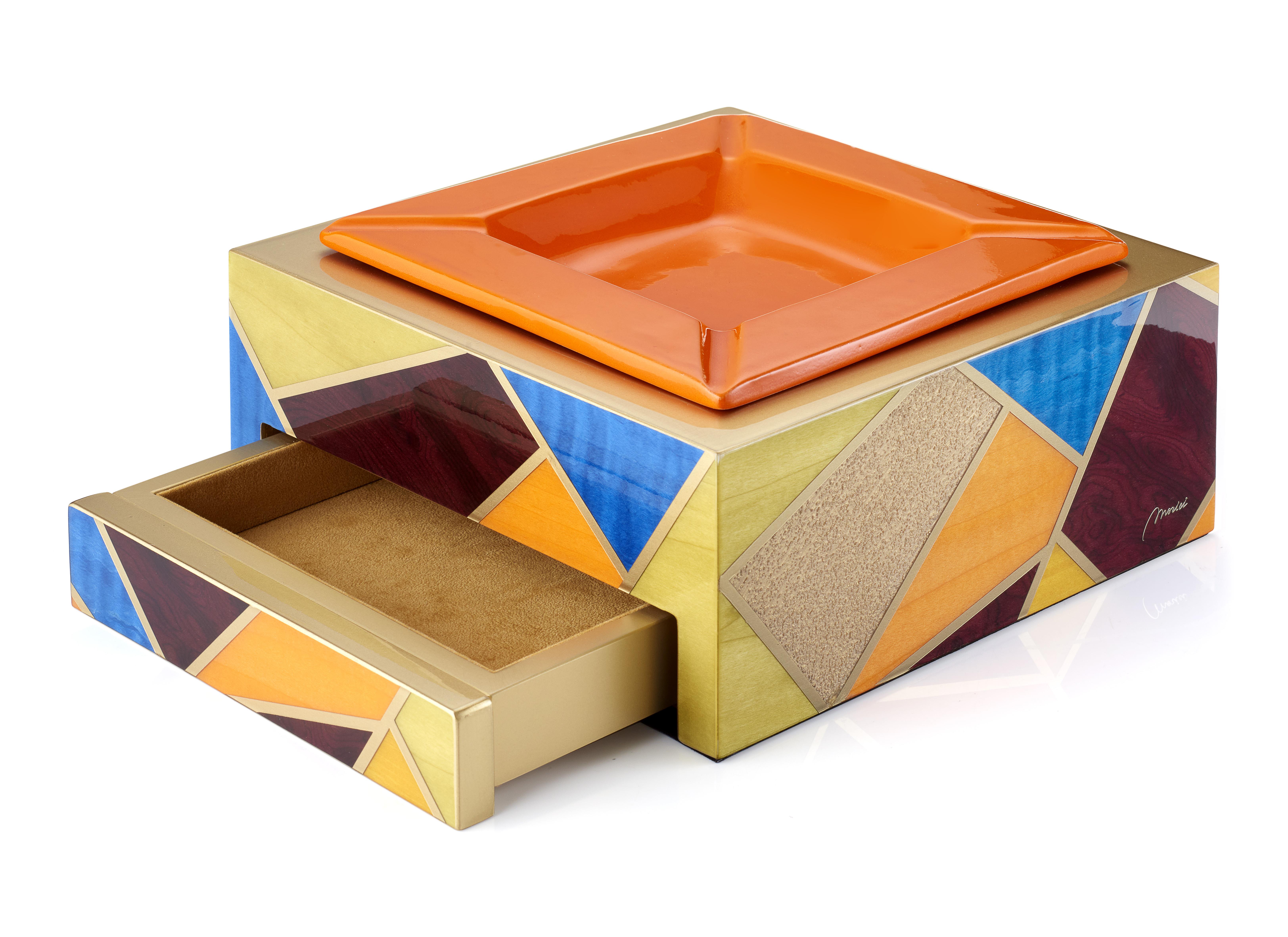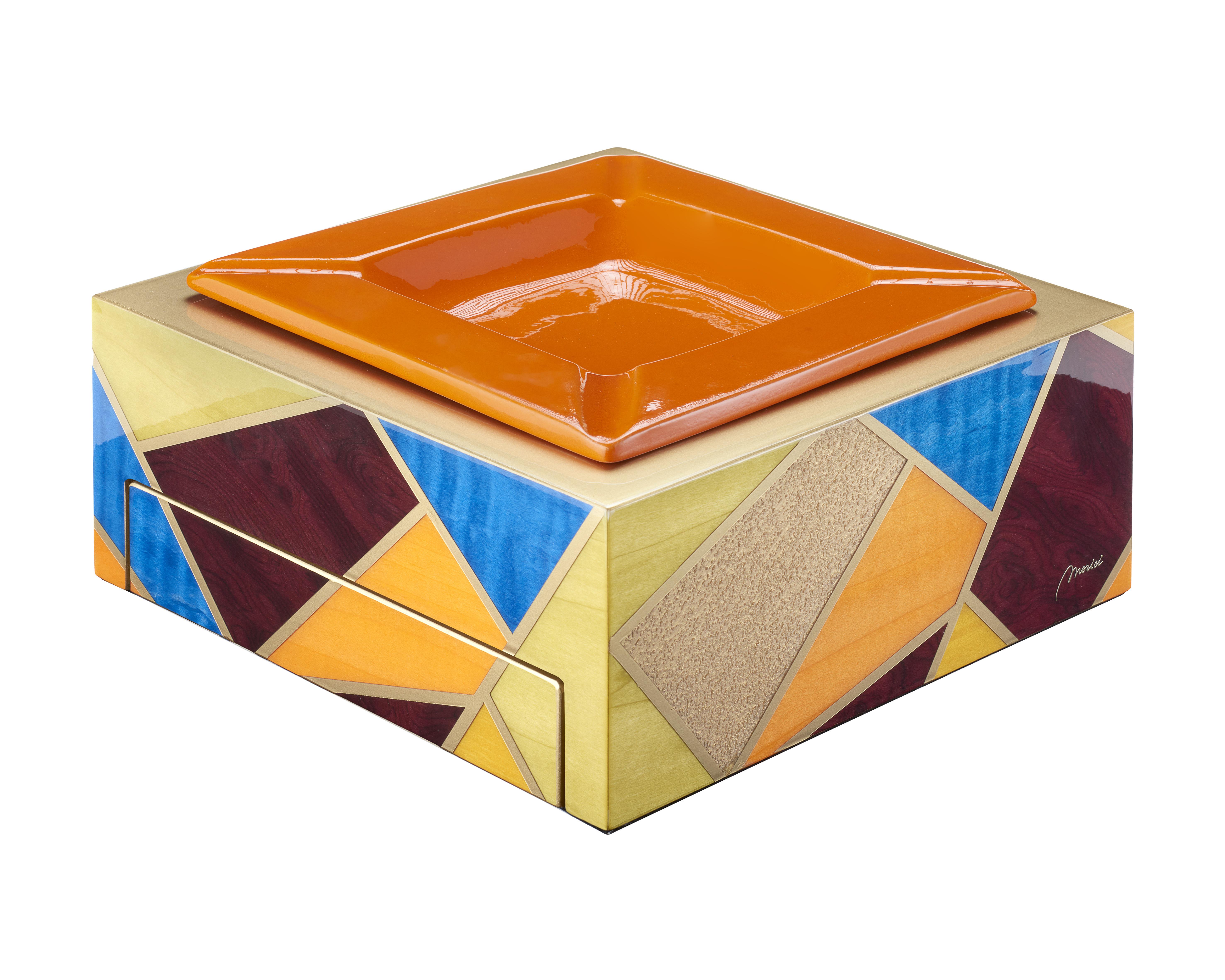 Farklı ahşap türlerinden üretilmiş, özel dokulu yüzey efekti ve ayna parlaklığında ekstra parlak vernik kaplamaya sahip küllük. Ön bölümde yer alan, altın sarısı Alcantara ile kaplı çıkarılabilir çekmece, puro ve sigara aksesuarlarını düzenli şekilde saklamak için pratik bir alan sunar.