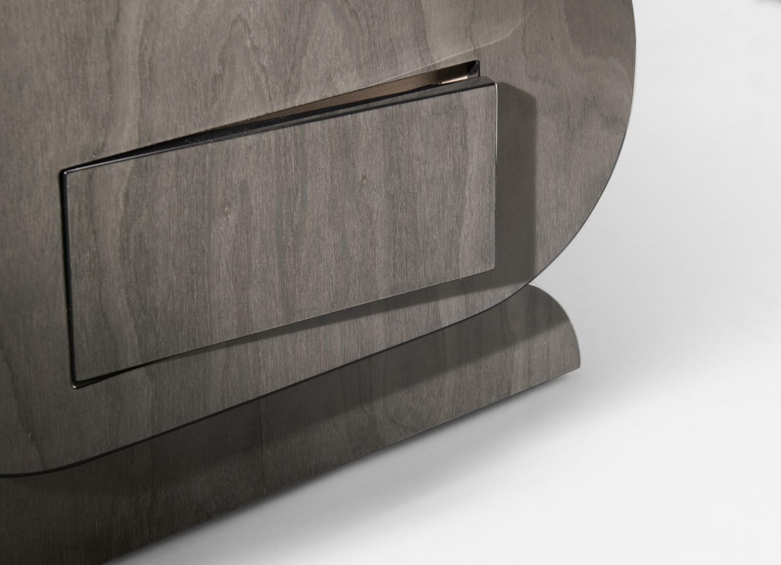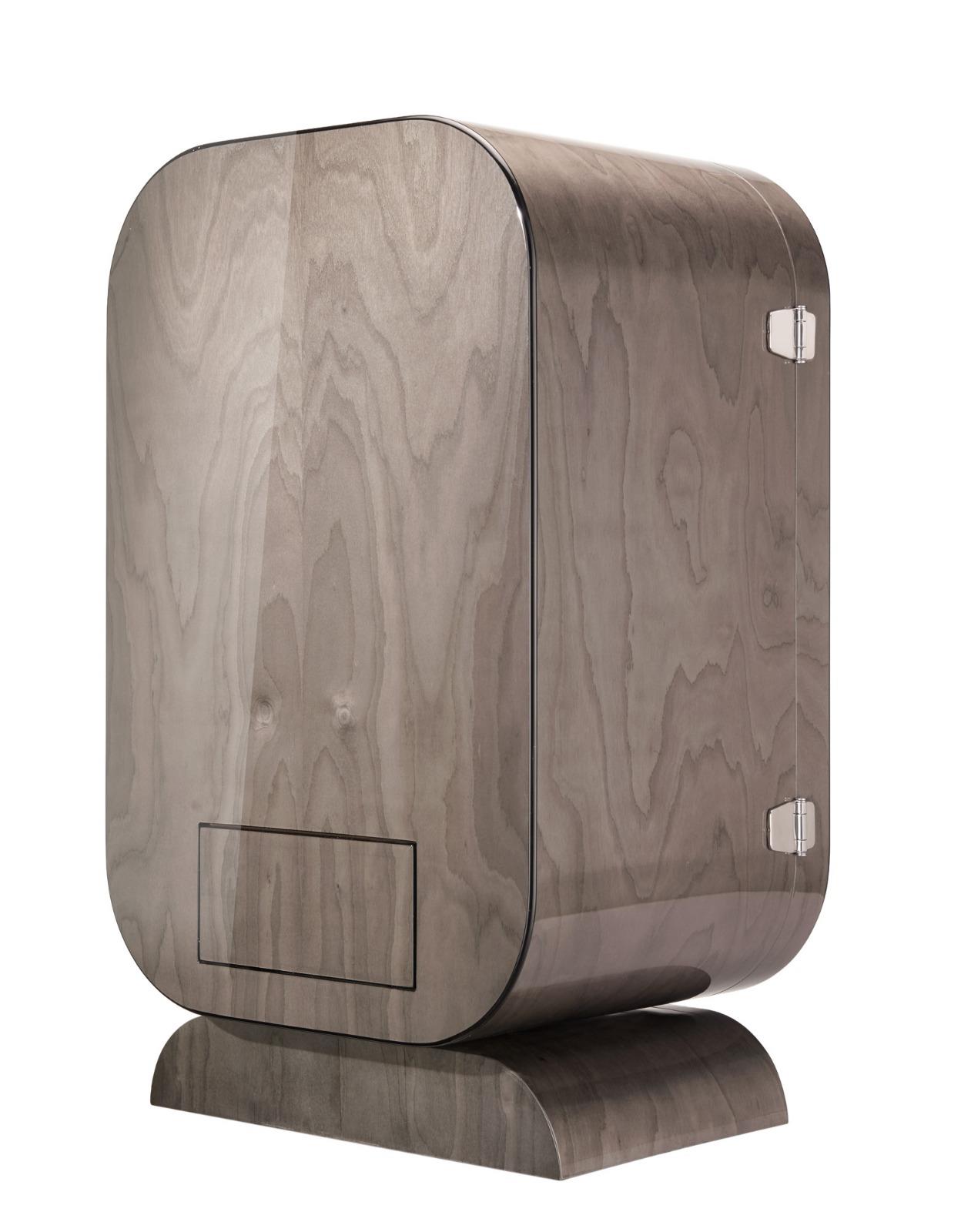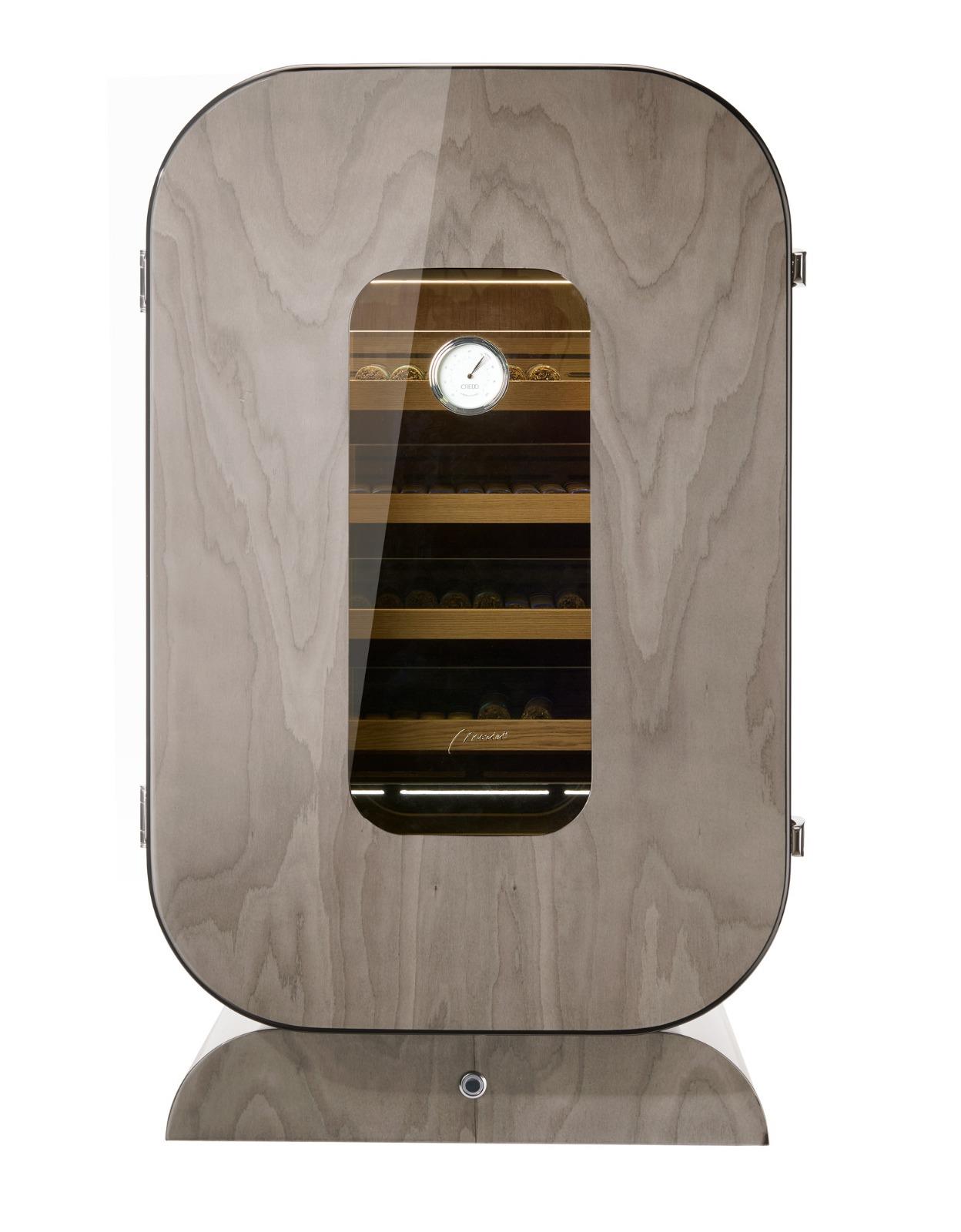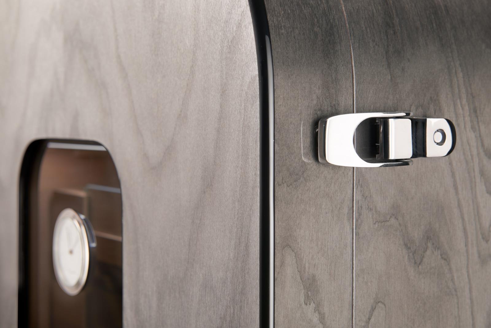 Ahşap kaplamalı ve ekstra parlak vernikli yüzeye sahip humidor dolabı. İç kısmı, sabit nem seviyelerinin korunmasına yardımcı olan ideal malzeme sedir ağacı ile kaplanmıştır. Paslanmaz çelikten üretilmiş çift kilit sistemi ve güvenlik anahtarı ile donatılmıştır. Kapakta füme renkli, şekillendirilmiş cam ve entegre analog higrometre yer alır.